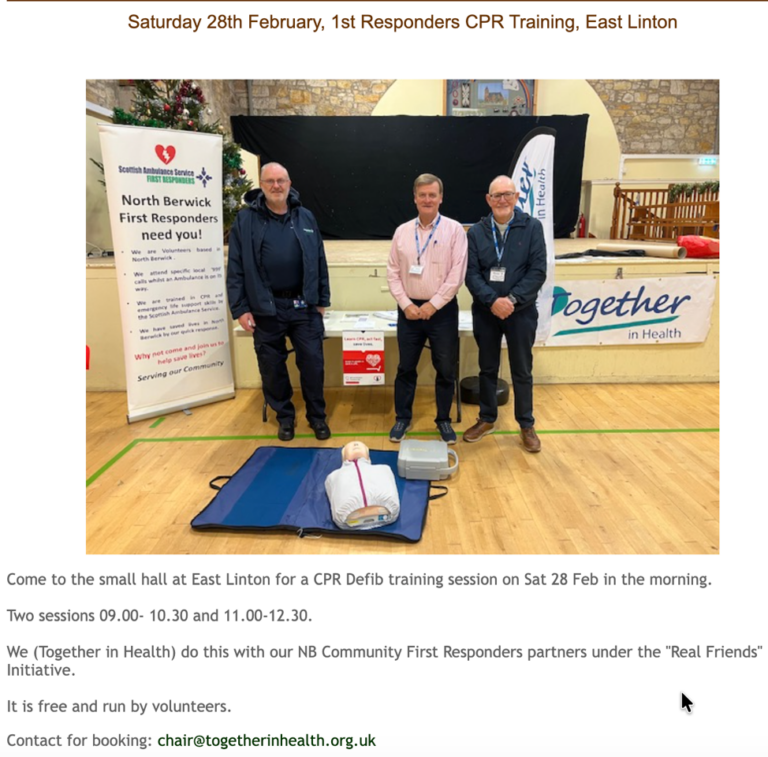 1st Responders CPR Training Small Hall of East Linton Village Hall 28th February 2026 Two Sessions 09:00 – 10:30 or 11:00 – 12:30 Free! Contact Chair@togetherinhealth.org.uk to book your place.